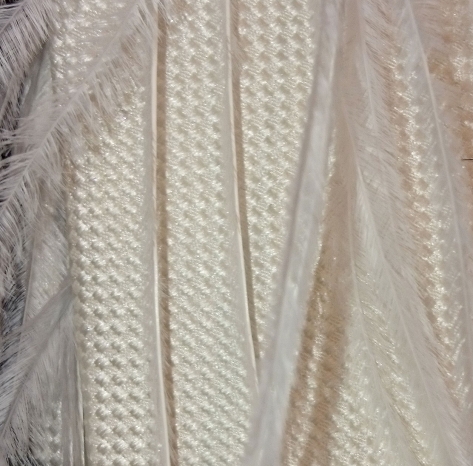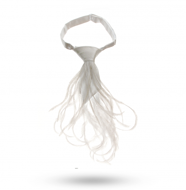 Pour ajouter de l’élégance et du raffinement à cette coupe courte et en biais, la cravate a été agrémentée de plumes d’autruche blanches. Les plumes d’autruche apportent incontestablement un effet de légèreté et de volupté à cet accessoire.