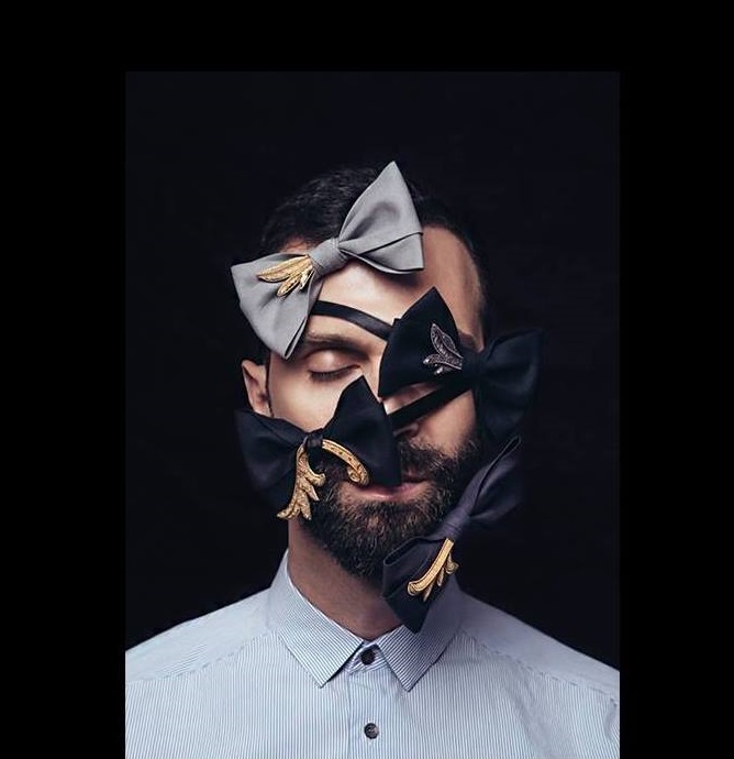 Son orfèvre Raffaele Stella Brienza a créée un noeud papillon en velours noir avec un double pan légèrement plissé agrémenté d’un bijou comme délicatement posé : une abeille ajourée de couleur noir.