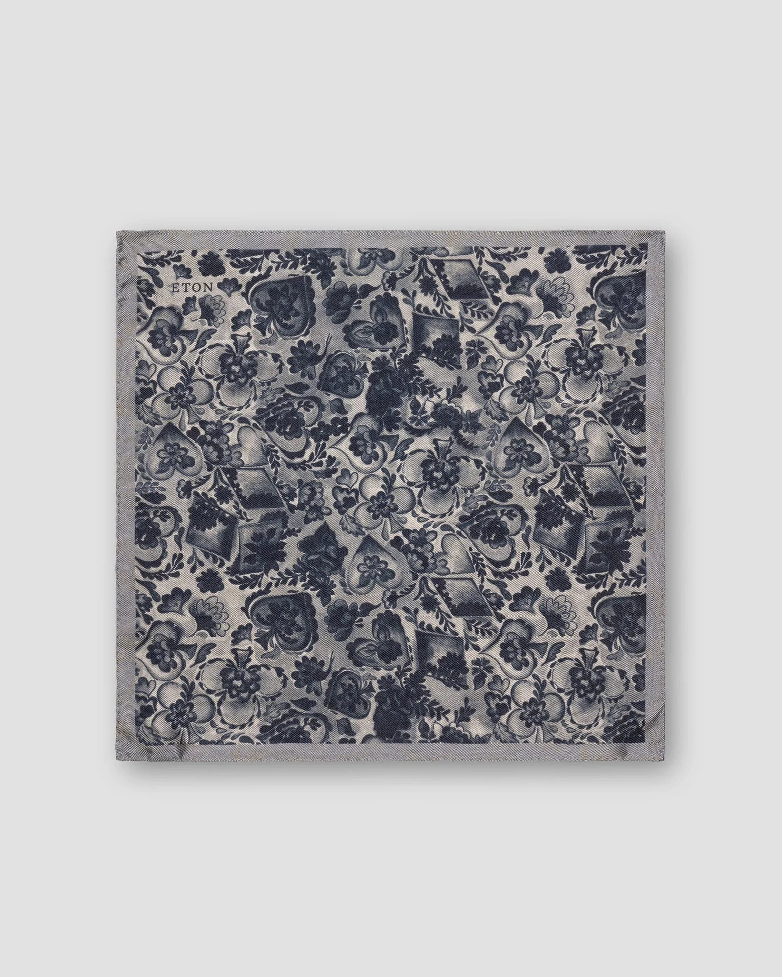 Pochette de costume en soie noire motif floral gris foncé. Les couleurs utilisées, le noir et le gris foncé donnent un côté très discret et élégant à cette pochette.