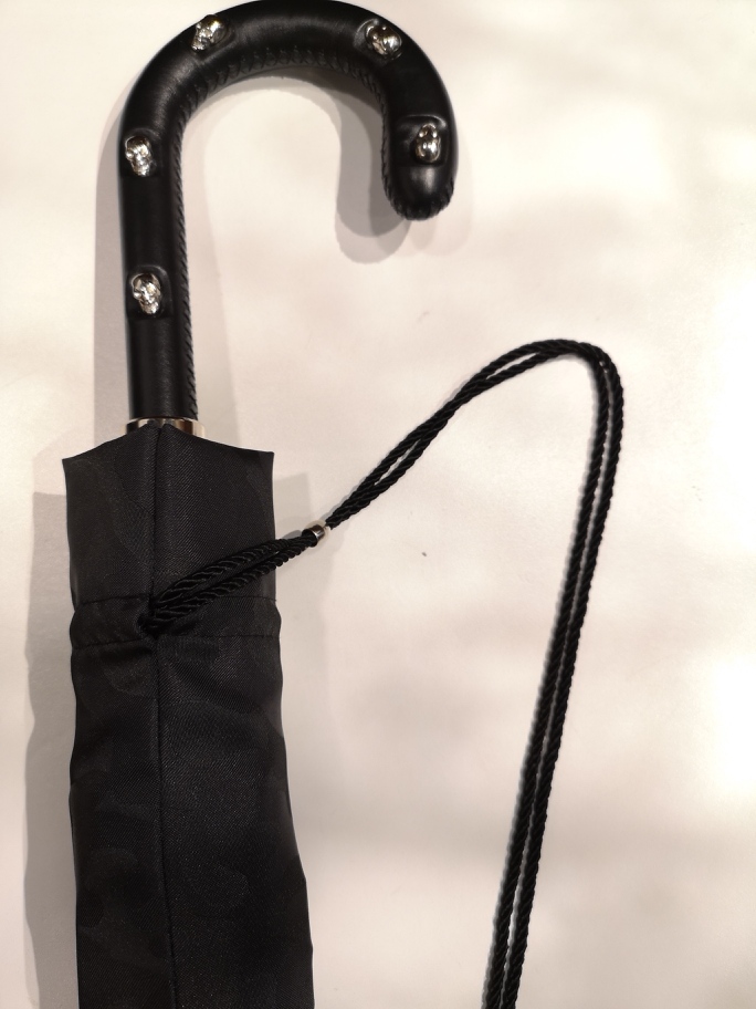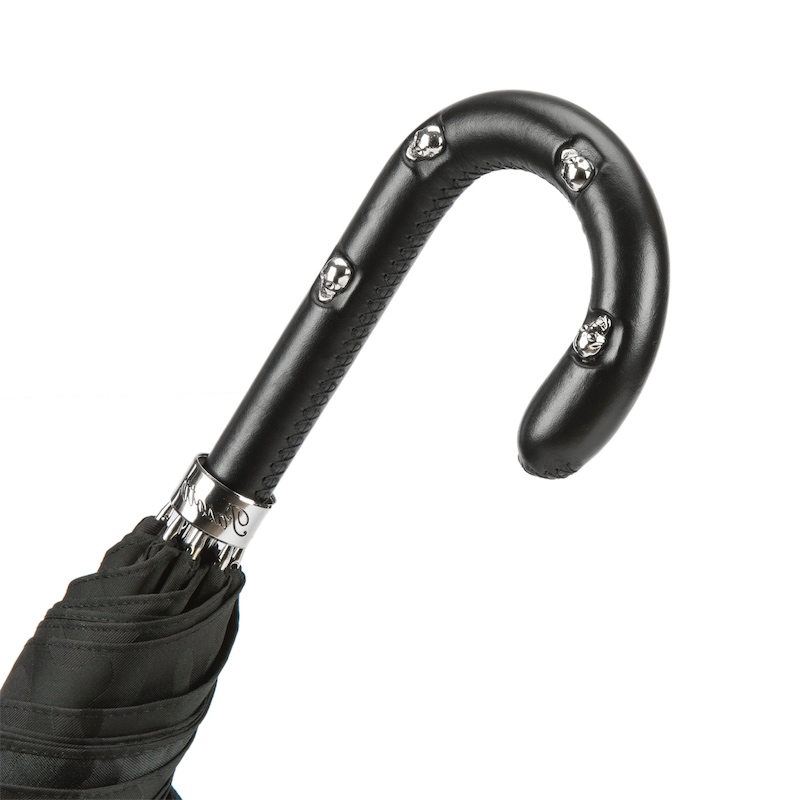 Nous avons choisi pour ce modèle une toile noire mat motif camouflage afin de renforcer le look travaillé de ce parapluie.  La poignée en cuir noir incrustée de têtes de mort est du plus bel effet que vous ayez un look « rock » ou « dandy ». Avec un diamètre en position « ouvert » de 110 cm vous pourrez en toute commodité vous promener à deux sous ce parapluie rock et chic