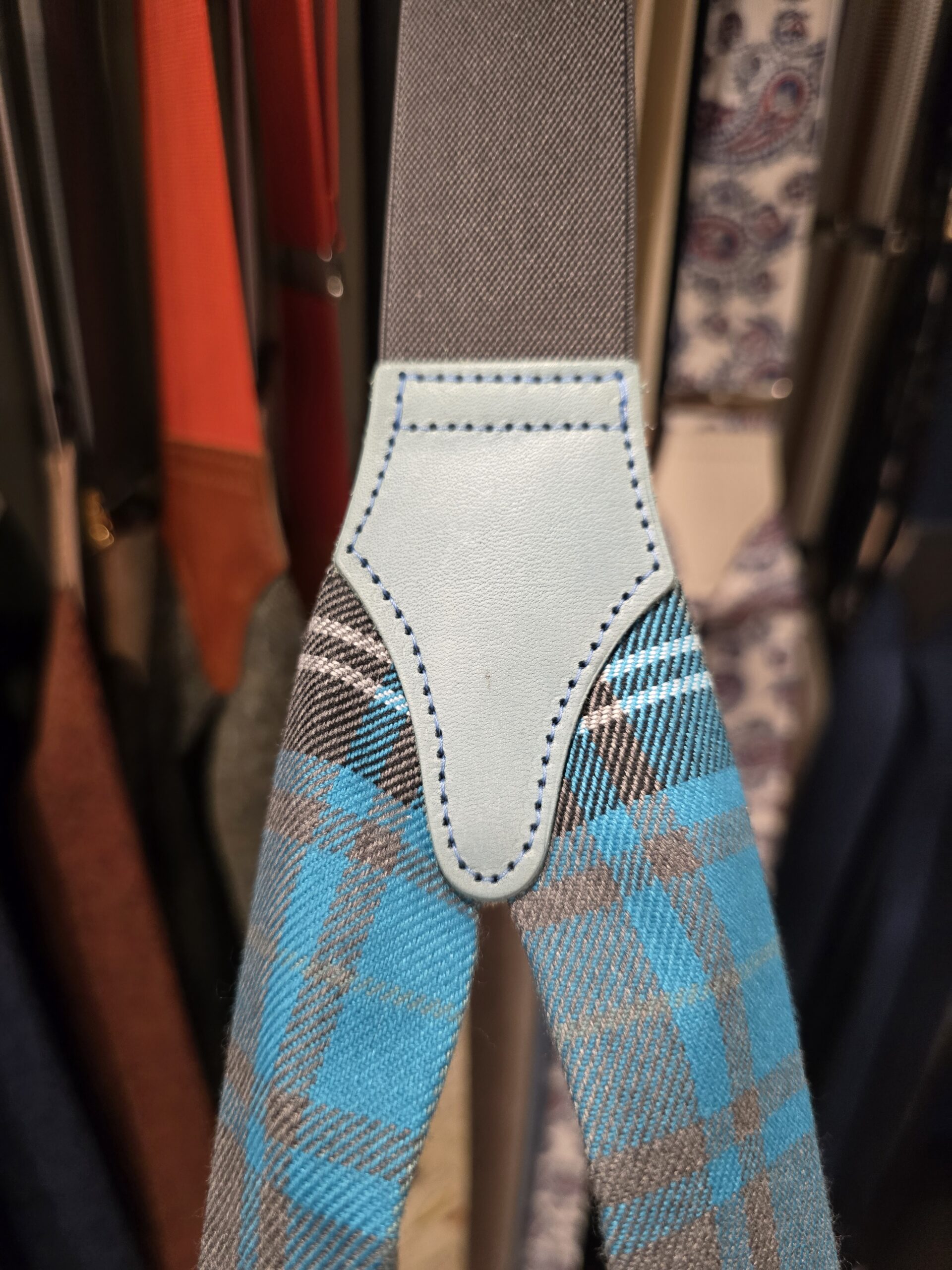 Ce modèle est fabriqué dans une laine au motif Prince de Galles bleu turquoise et greige. L’élastique est greige, les attaches sont en cuir de veau bleu clair, les pinces de réglage sont de couleur argentée.