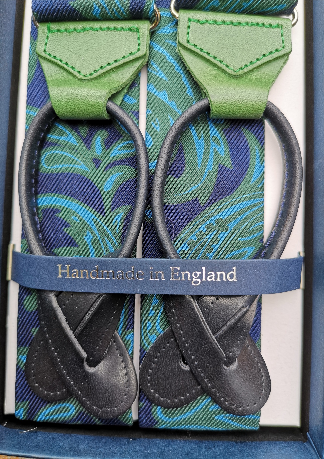 Ce modèle est fabriqué dans une soie à motif paisley kaki et bleu marine. L’élastique est bleu marine, les attaches sont en cuir kaki et bleu marine, les pinces de réglage de couleur argentée.