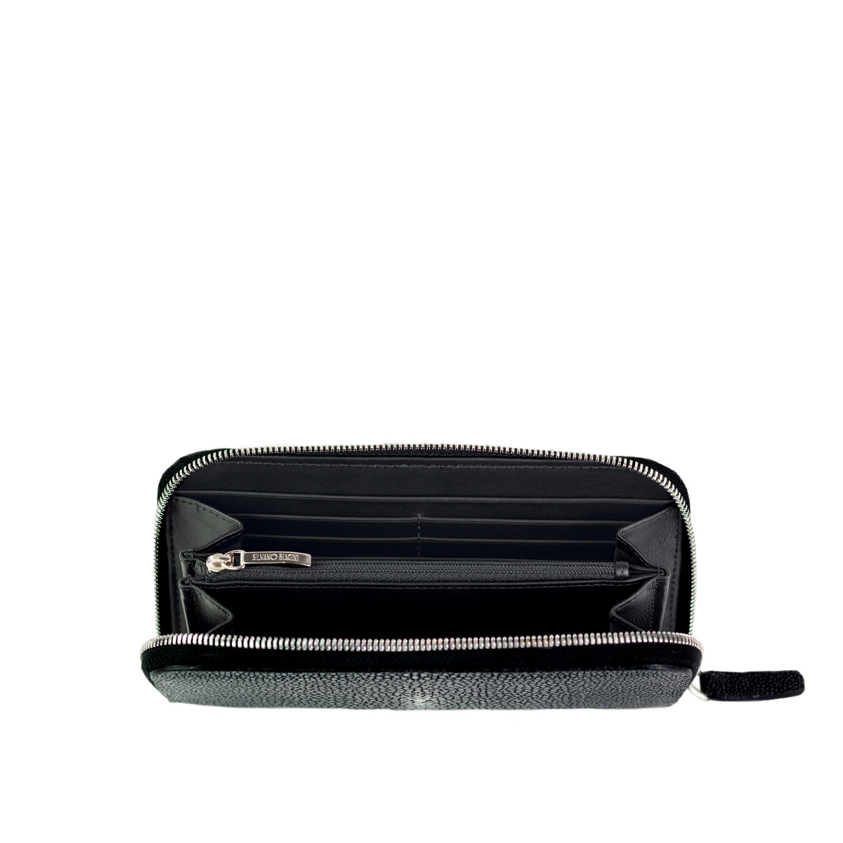 est une pièce rare et tout à fait exceptionnelle. Chaque portefeuille est unique car réalisé à la main pour Revenge Hom avec une peau de raie. L’intérieur très fonctionnel (peut contenir de nombreuses cartes bancaires, papiers, chéquier et monnaie) est réalisé en veau dans une couleur identique à celle du galuchat utilisé.