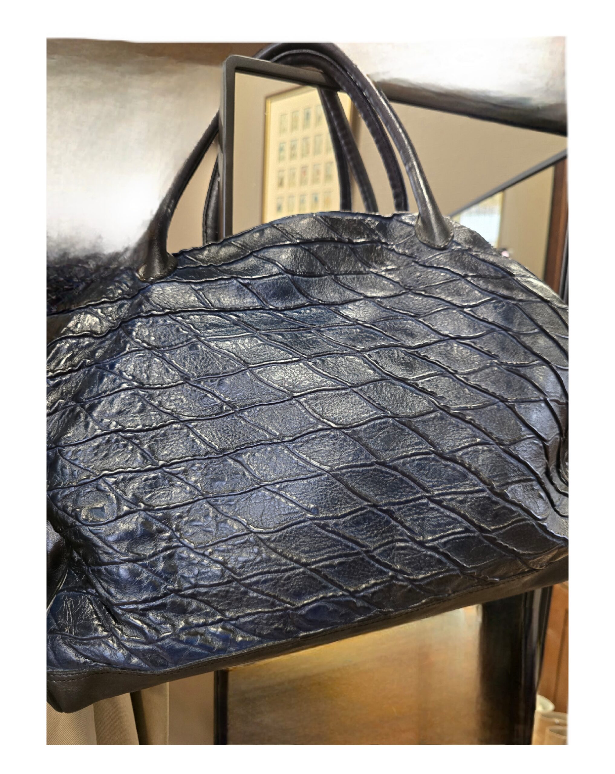 Patiné à la main, sa teinte navy donne de jolis reflets à la lumière.