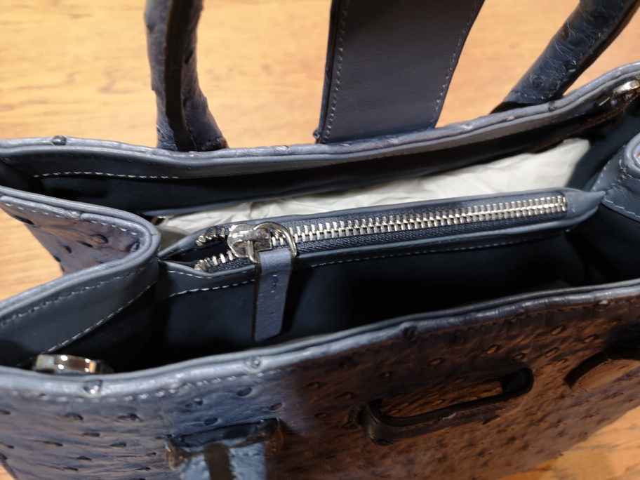 2 poignées et une bandoulière en cuir d’autruche bleue pour un porté main et épaule. Une grande poche centrale zippée à l’intérieur sépare 2 compartiments, une autre poche zippée plus petite pour un porte cartes. Les finitions sont également en cuir d’autruche bleue. 4 petites pattes métalliques pour le poser sans risque.