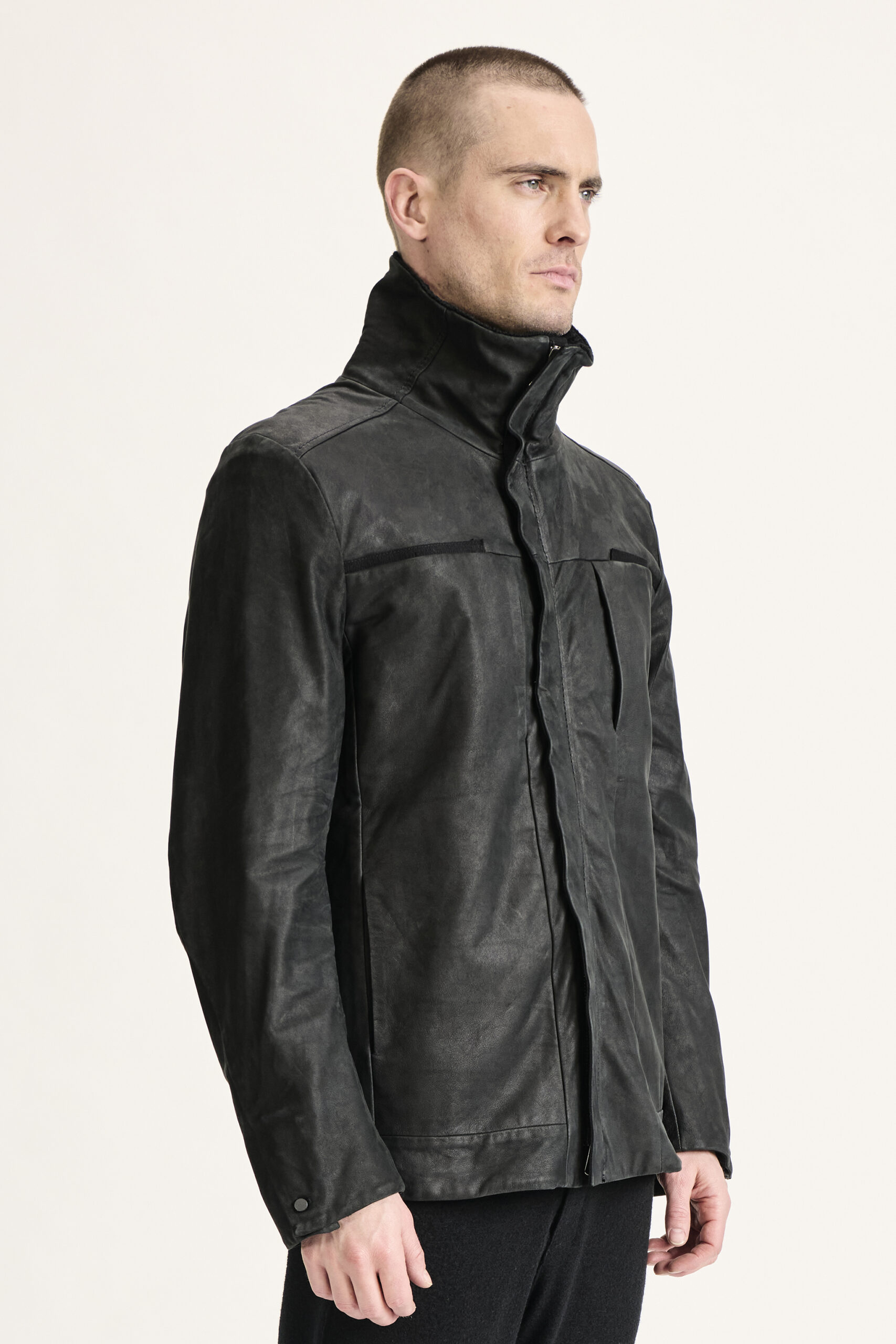 Cette veste militaire zippée associe la rigueur du cuir d’agneau mat à la douceur de la laine bouillie, offrant un contraste subtil entre matière brute et toucher chaleureux. Sa coupe droite est structurée par un col doublé de maille côtelée en laine vierge, des manches ergonomiques et des poignets fermés par un bouton en métal noir.